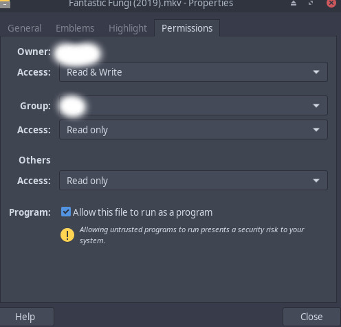 When I right click file permissions dialogue box. The “Allow this file to run as a program” is ticked.