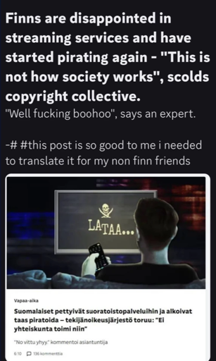 lanigerous@feddit.uk to Piracy: ꜱᴀɪʟ ᴛʜᴇ ʜɪɢʜ ꜱᴇᴀꜱ@lemmy.dbzer0.comEnglish · edit-27 days agoGood old Finland (subtitle is commentary, not in text)lemmy.blahaj.zoneimagemessage-square33fedilinkarrow-up1483arrow-down16file-text