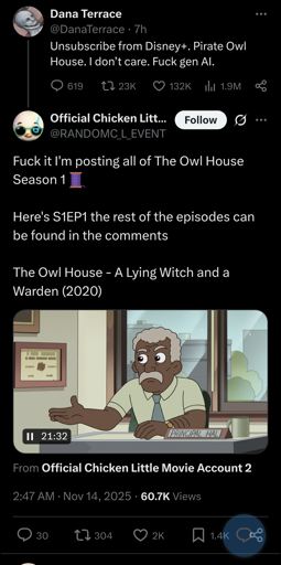 LiamBox@lemmy.ml to Piracy: ꜱᴀɪʟ ᴛʜᴇ ʜɪɢʜ ꜱᴇᴀꜱ@lemmy.dbzer0.comEnglish · 24 days ago'The Owl House’ creator Dana Terrace situation with Disney+ positive views on AI generated contentlemmy.mlimagemessage-square56fedilinkarrow-up1472arrow-down14