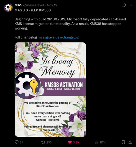 mr_MADAFAKA@lemmy.ml to Piracy: ꜱᴀɪʟ ᴛʜᴇ ʜɪɢʜ ꜱᴇᴀꜱ@lemmy.dbzer0.comEnglish · 24 days agoMicrosoft has blocked Massgrave's KMS38 activation method for Windowslemmy.mlimagemessage-square135fedilinkarrow-up1408arrow-down12file-text