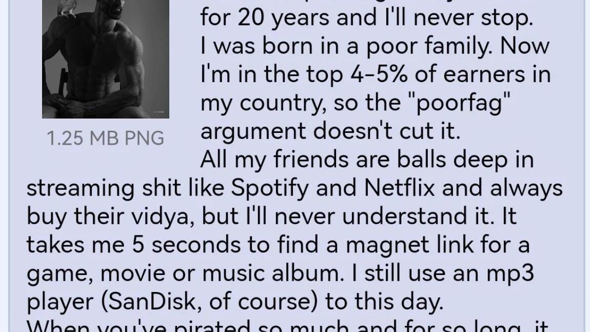 If you have enough money to live comfortably, I think you should pay for art you love. That doesn’t mean you shouldn’t pirate anything (especially from big corps), but please donate some money to indie games, music, theatre…