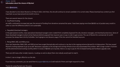 Rising RAM, SSD, and HDD prices Since last September, RAM, SSD, and HDD prices have surged dramatically and continue to rise due to the ongoing extreme demand for AI datacenters. This has caused Myrient’s hosting expenses to go up as well. Necessary upgrades to the storage and caching infrastructure only exacerbated the problem. With a large number of servers and the aforementioned existing monthly deficit in excess of $6000 out of pocket, there is no way to pay for the increased hosting and hardware upgrade costs.